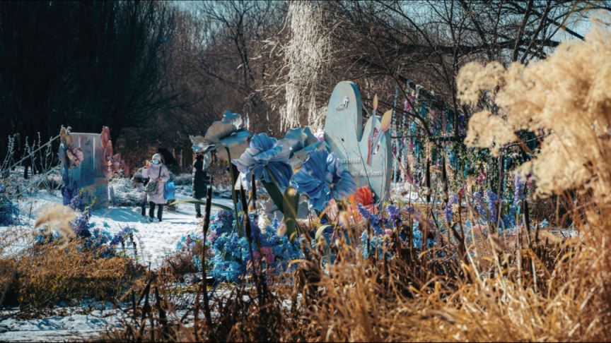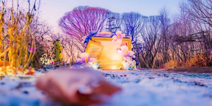 “冰雪花径”在入口左侧通道的芦苇丛处,设计围绕“冰雪中的春天”主题,将冰雪的纯净与花卉的生命力、芦苇的自然风韵、彩色灯光的梦幻效果相结合,对比鲜明却又和谐美妙,打造了一条穿越芦苇丛的梦幻花径。