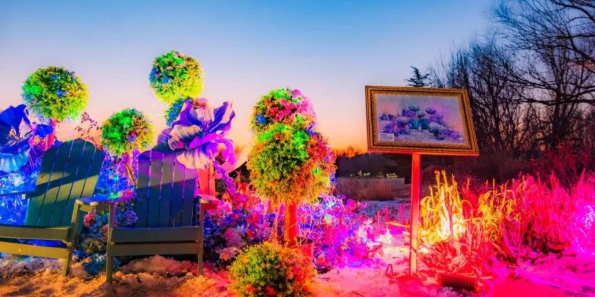 花园中心的大树被打造成了“光影梦境森林”,结合莫奈的印象派艺术元素与冬季光影,变身一座梦幻森林。银色珠链和彩色仿真花挂满枝头,夜晚雪花灯和流水灯渲染诗意,犹如森林仙境,市民游客可以在此感受“白雪却嫌春色晚,故穿庭树作飞花”的意境。